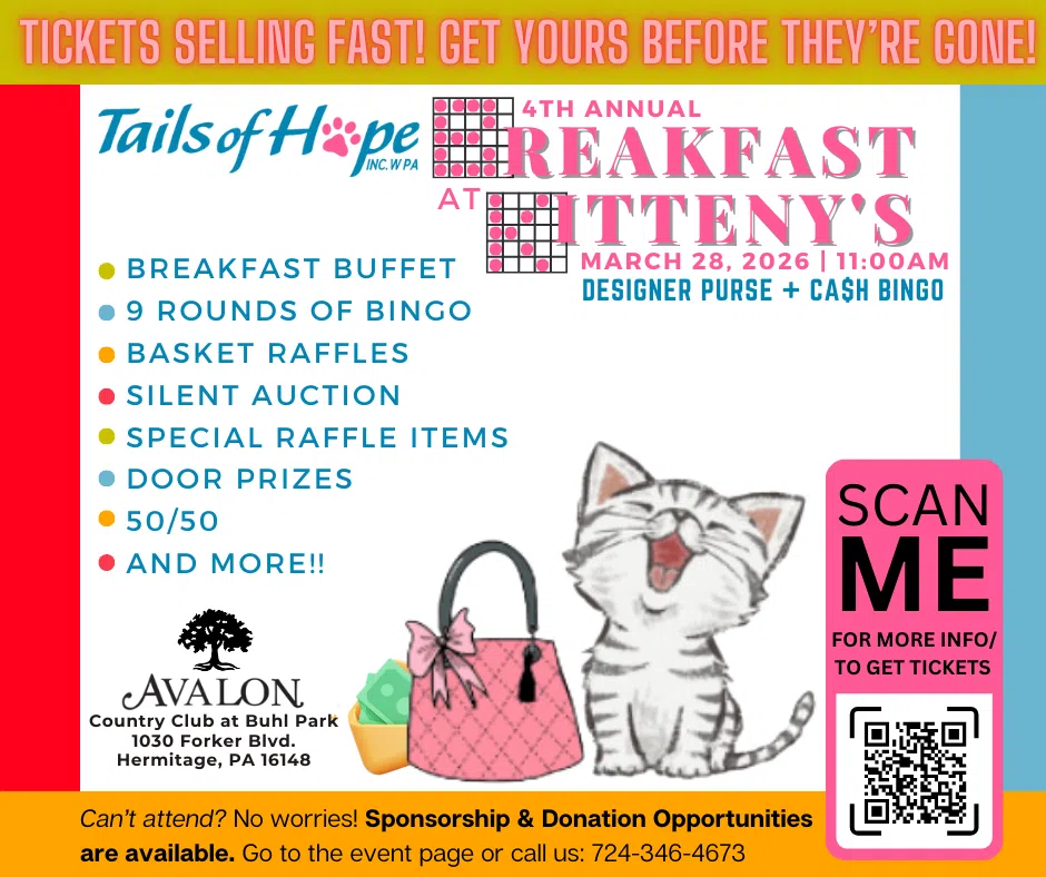 TICKETS: $45 individual or $320 for a Table of 8. Tickets can be purchased online or in-person with cash Monday-Wednesday or Friday, 9am-4pm, at Tails of Hope, 2450 Hoezle Rd., Hermitage, PA 16148. Tickets have been sold out in advance for the past three years and will not be sold at the door.